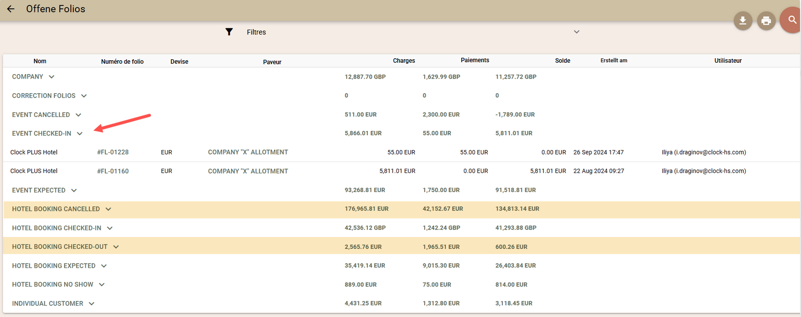 Ce rapport fournit le montant total des frais les folios ouverts, avec la possibilité de suivre les folios séparément pour les sociétés, les événements et les réservations. Par exemple, il permet d'identifier rapidement s'il existe des frais non facturés valides dans les folios des réservations annulées ou dont le départ a été effectué.