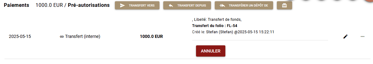 Il est possible à tout moment d'annuler le transfert de paiement. Vous pouvez le faire à partir de n'importe quel folios correspondant (source ou destinataire). Il suffit d'ouvrir le folio à examiner et, dans la section "Paiements et autorisations préalables", de trouver et d'annuler le paiement de type Transfert (interne). Le système annulera également le paiement correspondant dans le folio concerné.