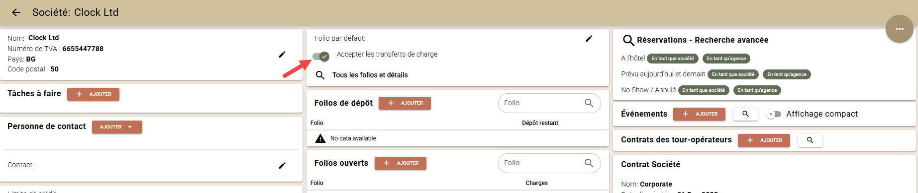 Pour permettre le transfert de services de diverses sources vers les folios, activez l'option 'Accepter les transferts de charges' pour l'entreprise liée à l'événement donné.