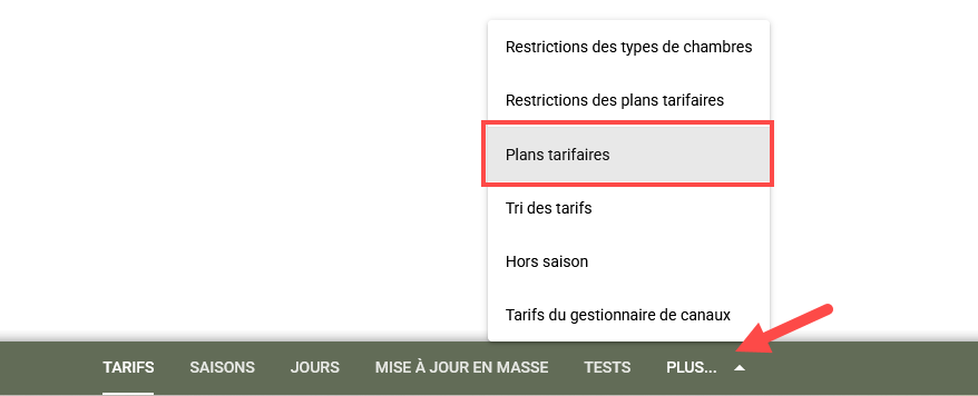 Pour archiver un plan tarifaire, accédez à la section des plans tarifaires - menu Paramètres -> Plans tarifaires. Cliquez sur l'onglet 'Plus...' et sélectionnez 'Plans tarifaires'.