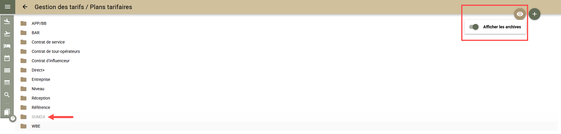 Pour restaurer un plan tarifaire, accédez à la même section et, à partir de l'icône en haut à droite, sélectionnez 'Afficher les archives'.